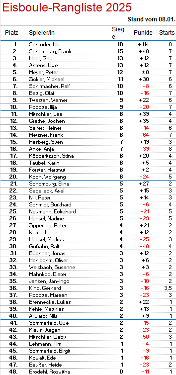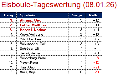 Nach den üblichen 3 Runden blieb Uwe Ahrens (+12) als einziger ungeschlagen. Im folgten Matthias Fehle (+13) bei seiner ersten Eisboule Teilnahme in dieser Saison und Nadine Hänsel (+11) mit je zwei Siegen. In der Gesamtwertung führen weiterhin Ulli Schröder und Frank Schomburg. Weiter geht es am 15. Januar um 18 Uhr am Erbenholz in Rethen. Wir freuen uns auf Euch!