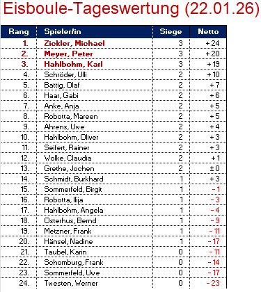 Nach den üblichen 3 Runden bleiben 3 Spieler ungeschlagen. Den Tagessieg sicherte sich Michael Zickler (+24) vor Peter Meyer (+20) und Karl Hahlbohm (+19). In der Gesamtwertung bleibt Ulli Schröder in Führung vor Frank Schomburg und Uwe Ahrens. Weiter geht es am 29. Januar. Wir freuen uns auf Euch!