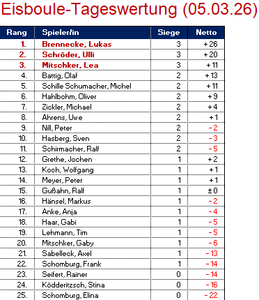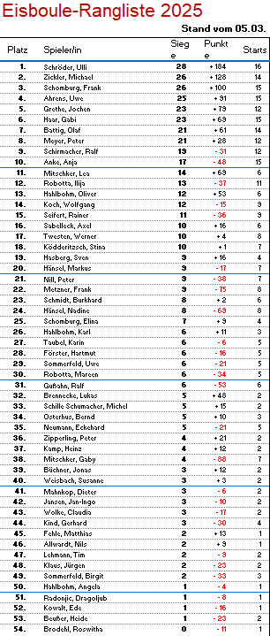 Am Donnerstag Abend trafen sich 25 SpielerInnen zur 16ten Runde Eisboule am Erbenholz in Rethen. Zwar wurde es trotz der frühlingshaften Temperaturen im Laufe des Abends noch recht kühl, aber Alles in Allem hatte das Wetter nicht mehr viel mit Eisboule zu tun. Der Frühling ist da! In den nächsten Wochen stehen noch 4 Runden Eisboule an, bis die Serie am Gründonnerstag enden wird. Zum fünften Mal in diesem Winter blieb Ulli Schröder (+20) am Donnerstag ungeschlagen und sicherte sich damit Platz 2. Der Tagessieg ging an Lukas Brennecke (+26) und das Podium vervollständigte ebenfalls ungeschlagen Lea Mitschker (+11). In der Gesamtwertung baut Ulli Schröder damit seinen Vorsprung aus und führt mittlerweile seit 15 Spieltagen in Folge die Gesamtwertung an. Weiter geht es am 12. März um 18 Uhr. Wir freuen uns auf Euch!